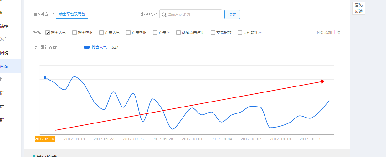 小圆包与斜挎包,小圆包这个词的搜索人气不一定是最高的,他的综合数据不一定是最好的。但是当客户需求这种圆形包的时候,小圆包这个词他的转化率,一定是最高的。因为这个词他的需求就是最精准的。