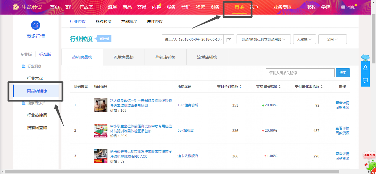 通过刚刚的介绍,这4种组合方式都是存在一个共同点的,同学们认为这4种组合方式的共同点是什么?以上4种组合方式都是围绕目标词去延伸的!对不对?一个标题中绝对含有目标词!那么这个目标词怎么样去确定呢?很多人都不知道!关于目标词的确定老师在这里好好给大家讲解一下!接下来老师先给大家演示在市场行情里面的操作方式!首先我们进入市场行情(卖家中心——生意参谋——市场)点击市场行情里面的“商品店铺榜”